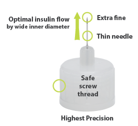 The protective cap of each individual pen needle has a specific colour according to the needle length, so that the different lengths can be easily distinguished from each other (colour coding). During diabetes training, the correct needle length for each insulin-injecting person with diabetes is determined together with the medical staff in charge.